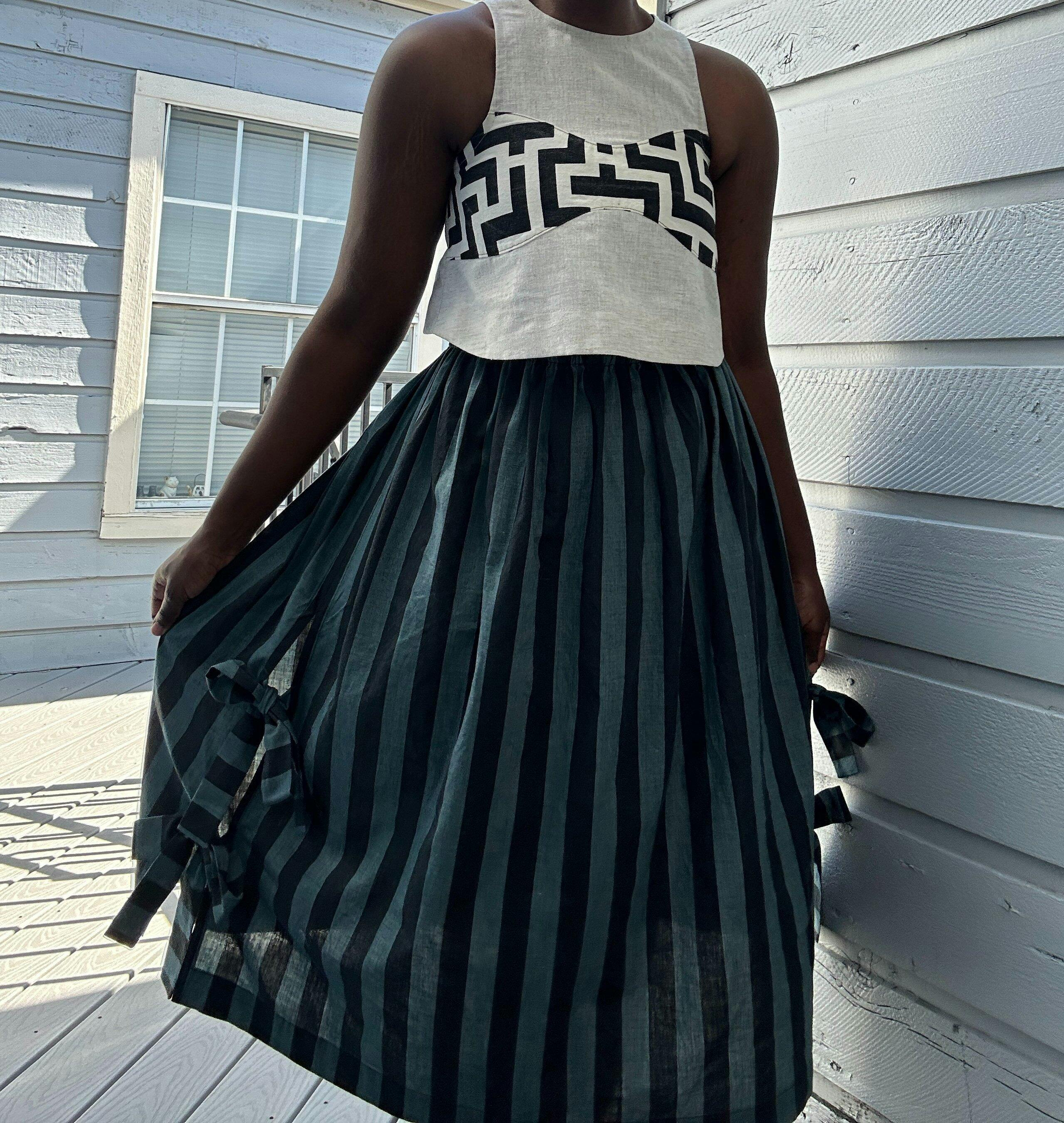 The Ballet Bow Skirt is the definition of simple, classic and feminine. The elastic waistband makes this an easy to sew staple for seasoned makers and a perfect starting project for beginners. Two dramatic side slits are secured with fully functioning bows. Constructed from simple rectangles and finished with self-enclosed seams this skirt does not require a printed pattern or serger. The lengths, side slit size and bow placements are all suggestions. Please use this pattern as a guideline and jumping off point to create the skirt of your dreams. Plié away!