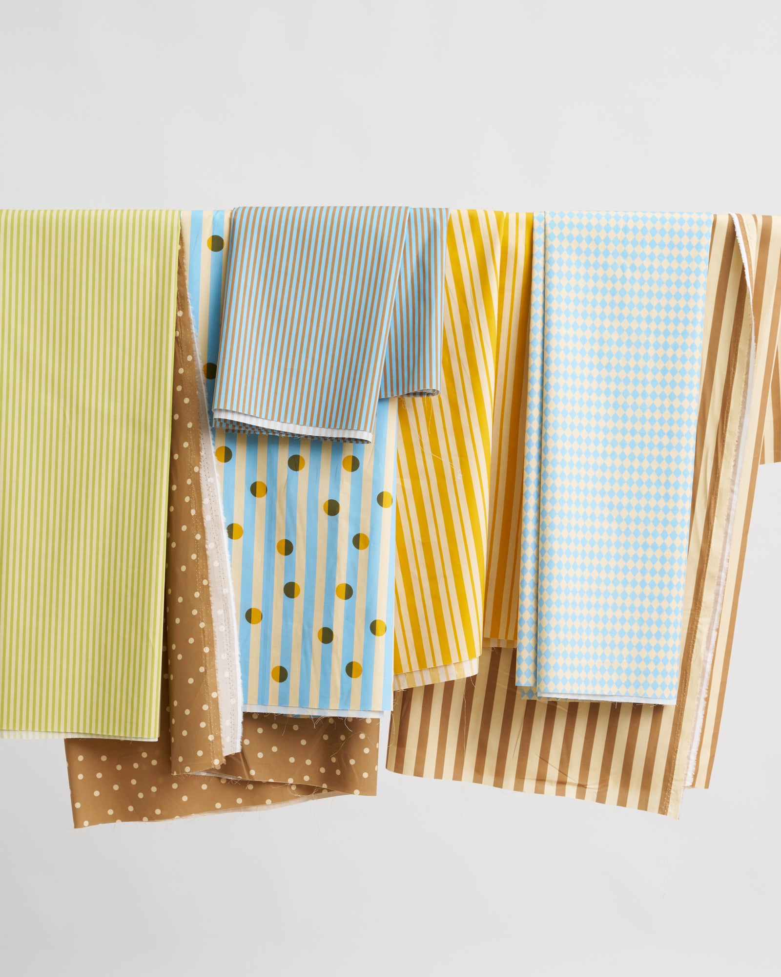 Our custom printed smooth cotton poplin is pure springtime joy. A playful mix of dots and stripes in a palette that feels cheerful and lighthearted.