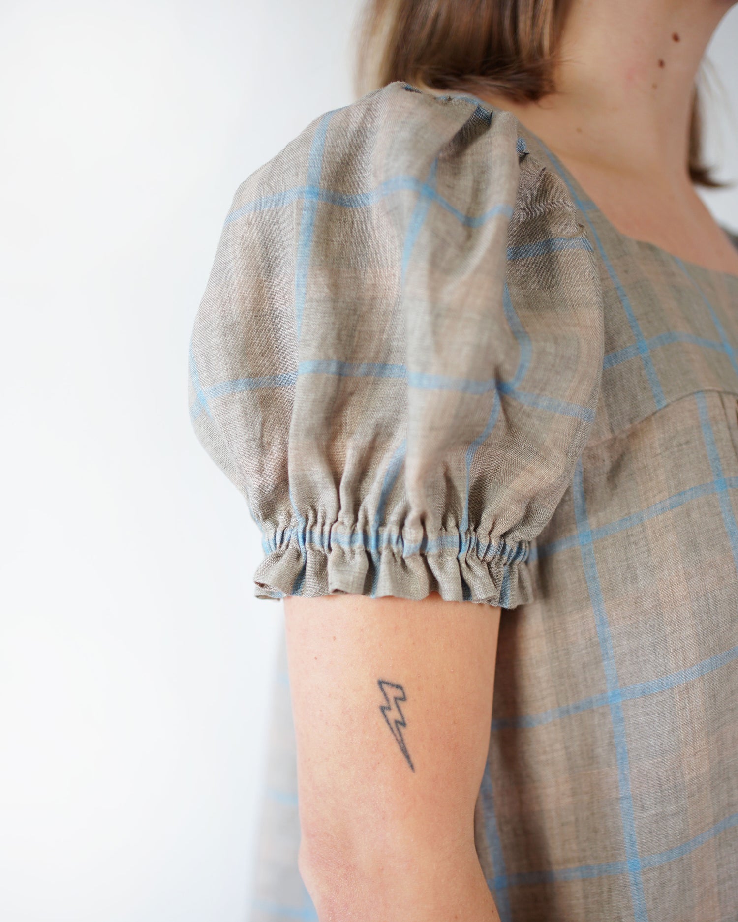 The Champagne Field Dress is a prairie style dress with patch pockets and optional patchwork view with inseam pockets. The front and back bodice include soft gathers that sit above the bust. View A is a mini dress, hitting above the knee and includes a flutter sleeve. View B is a midi dress, hitting mid calf with a high-low hem and gathered puff sleeves finished with a wide elastic cuff. Both views include a large bottom ruffle. View C is a babydoll style top which include soft gathers that sit above the bust and has a flowing bell sleeve. The length is semi cropped that hits right below the natural waist.
