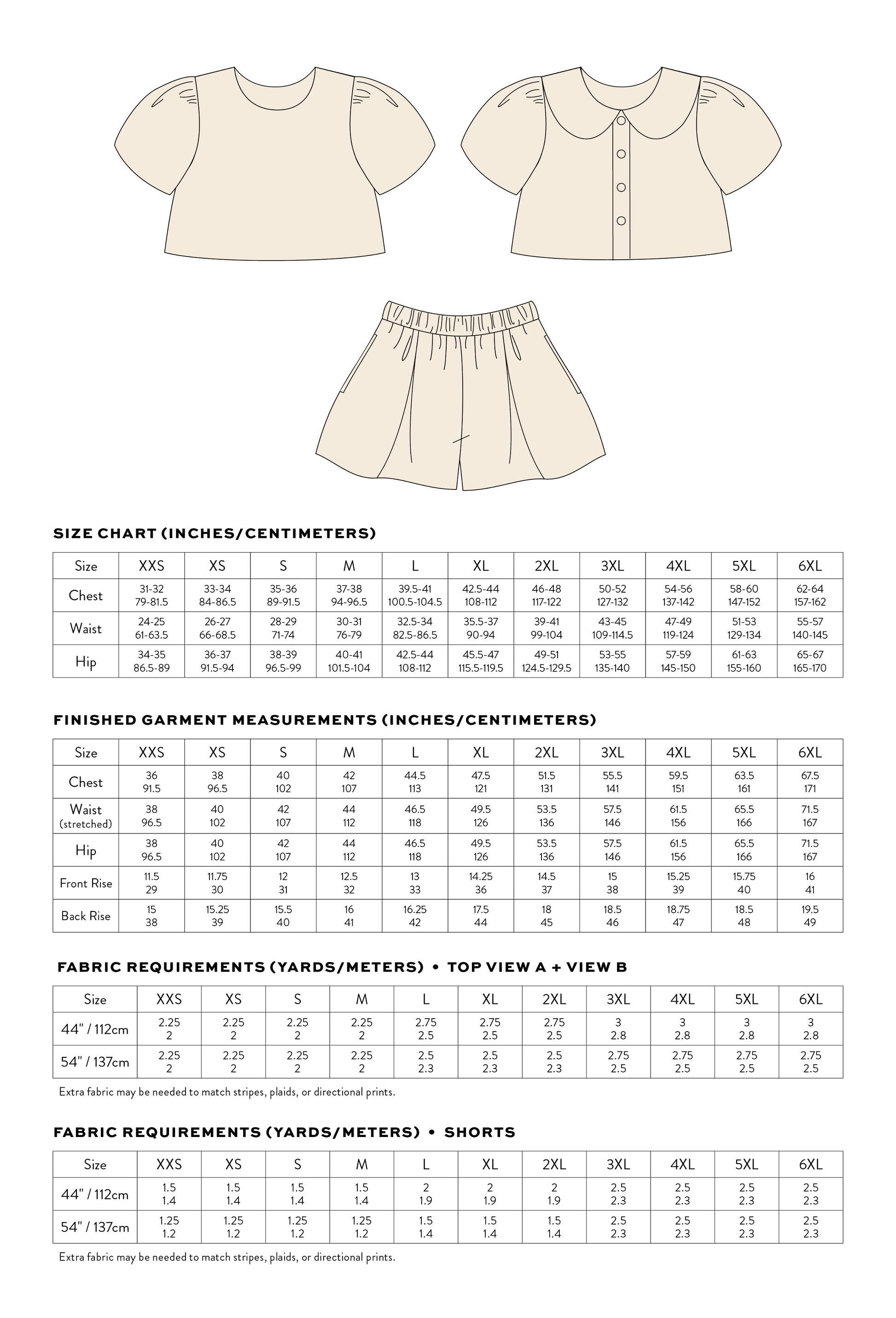 The High Tide Set is a vintage-inspired top and shorts sewing pattern that feels breezy, chic, and effortlessly feminine. The cropped top features a wide crew neckline, micro puff sleeves, and an optional button placket with a sweet Peter Pan collar, while the high-waisted shorts include an elastic waist, soft front pleats, and inseam pockets for a relaxed A-line fit. With both cropped and longer length options included, this comfortable set is perfect for warm-weather sewing and everyday wear.
