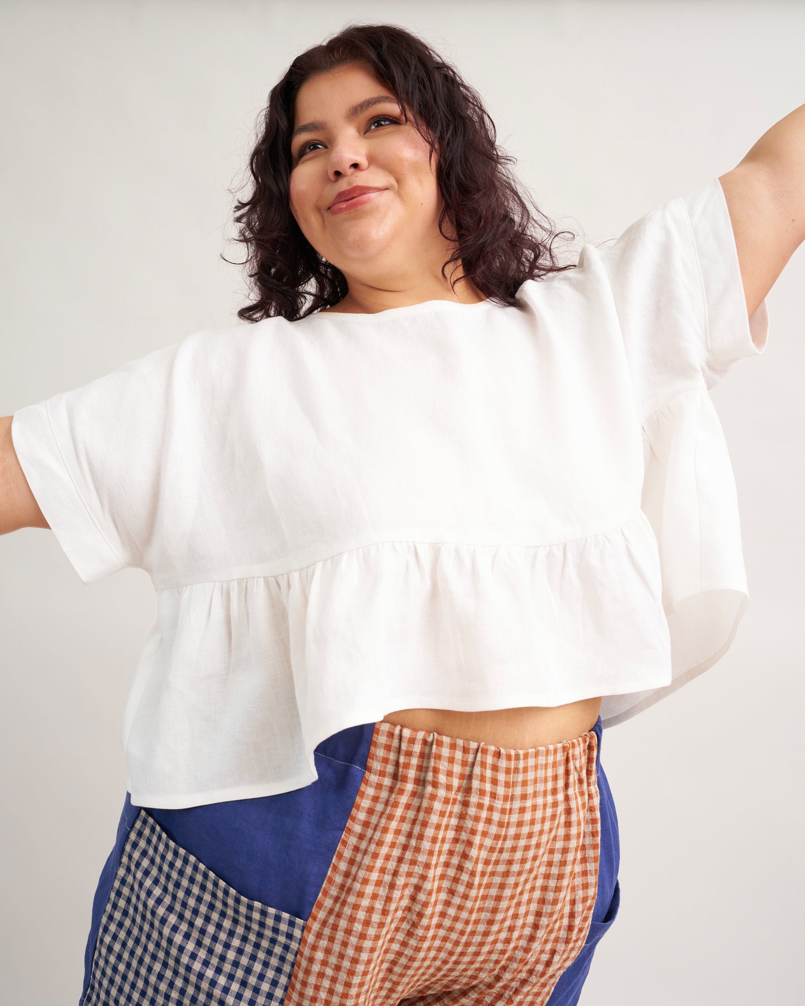 The Wave Float Top is designed for light to midweight woven fabrics. Your fabric choice will shape the overall look and feel of the top. For a crisp, structured silhouette, choose fabrics like cotton shirting, lightweight twill, or linen blends. For a softer, more relaxed drape, opt for washed linen, lightweight cotton, or other breathable woven fabrics with movement. When sewing patchwork, we recommend using fabrics with similar weights to ensure even gathers and a balanced finish.