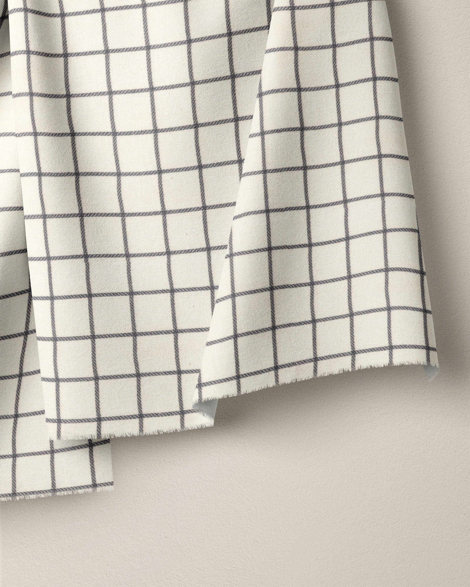 Sure to become a fabric staple is our 100% cotton handwoven window pane check. This beautiful fabric has a 3/4" grid pattern in a soft black on a creamy white background. This classic pattern pairs well with just about anything and is a must add to your me made wardrobe. This lovely cotton is light to medium weight with a wonderful gentle drape that holds its shape without any stiffness. It washes up to be incredibly soft with a subtle pebbly texture for instant comfort and lived in look.